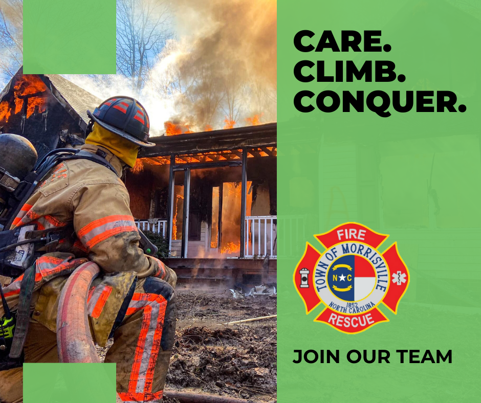 We are always searching for individuals who CARE about others, whether their house is on fire, may have been in a car wreck, or can’t breathe from asthma. We’ll teach you new skills to help CLIMB throughout life while making lifelong friends. Ultimately, you’ll gain confidence in your abilities to CONQUER challenges while making Morrisville a safer place to live connected, live well.
